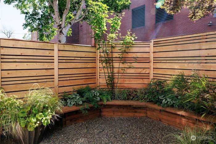 Next, the rusting galvanized fence was given a modern facelift with cedar laid horizontally, bringing a welcome warmth to the small space. Finally, to ensure vibrant color and form year-round, we also added Heuchera ‘Peach Flambe’ and ‘Delta Dawn,’ and Carex ‘Ice Dance.’